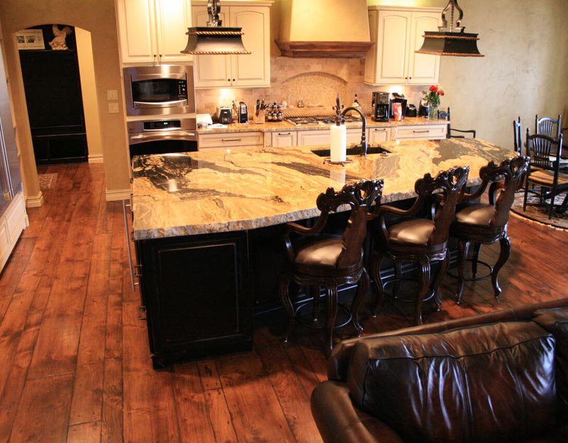 Some finishes work better than others for kitchen floors. Gloss and semi-gloss finishes can yield an attractive high-polished look, but they also show scratches and scuffs very easily, so many people don’t like them for kitchen floors. For kitchens receiving lots of use, a natural matte finish is usually best. Better yet, if you prefer a more textured look, distressed floors are excellent for hiding scratches and scuffs.